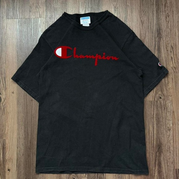 Keywords: Champion, T shirt, Medium, Black, Spell Out Logo, Short Sleeve, Casual, Menswear, Cotton, Athletic, Retro, Classic, Comfortable