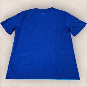 This Champion T-shirt in medium size features a stylish blue colorblock design. Made for fitness and sports, it showcases the iconic Champion spellout.