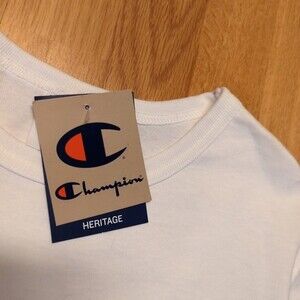 Champion Mens Small Heritage Embroidered Logo White Crewneck T-Shirt NEW. Armpit to armpit measures approximately 18.5" and length 28'