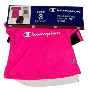 Champion Toddler Girls 3 Piece Active Set Size 18M "Your little Champion will love getting dressed with this new set perfect for school or play! Featuring fun colors, great graphic designs, comfy fabric and 2 different tees to compliant the shorts. Your little princess will look amazing in this beautiful set • Crewneck • Blended Fabric • iconic "C" logo heat seal Clothing Size - 18M Color - Knockout Pink/White/Black