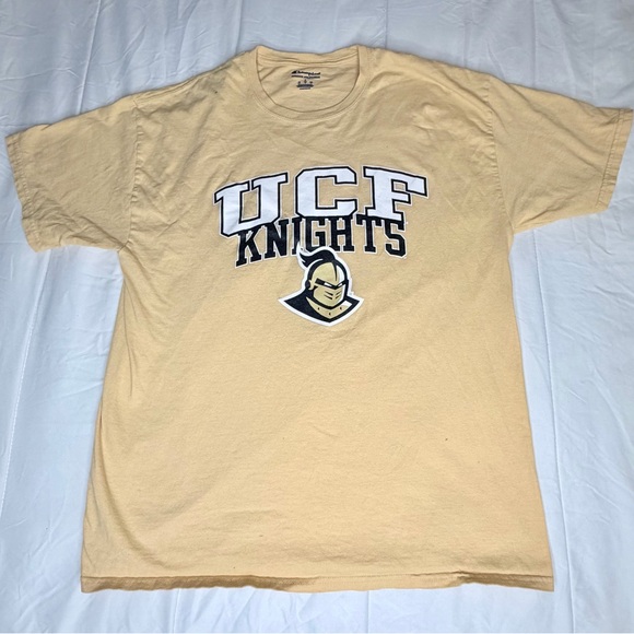 For sale is a Champion UCF Knights men’s t-shirt in gold/tan, featuring a screen print graphic of the team name and mascot helmet logo. This size Large shirt is perfect for college sports fans, Knights supporters, or Champion apparel collectors.