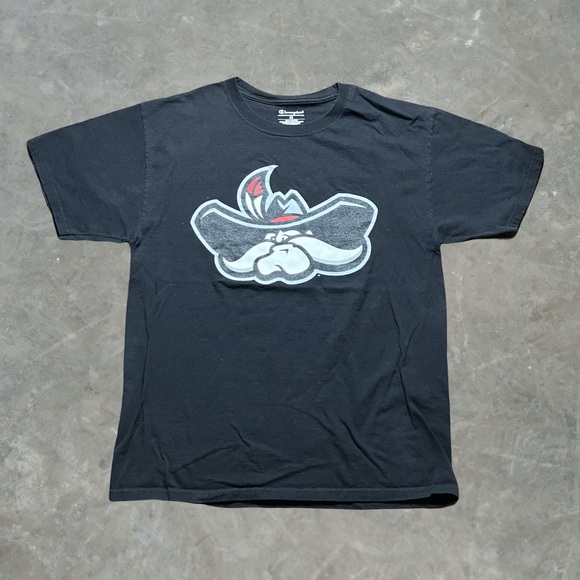 This item is part of my 3 for $25 sale! American college double sided black t shirt by Champion for the University of Nevada Las Vegas Rebels that is in good condition aside from a faint bleach stain and cracking on the graphics