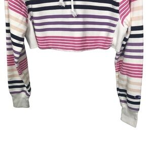 Urban Outfitters UO x Champion reverse weave, striped, cropped hoodie. Has raw hem and ribbed side panels. Preowned but in good condition.