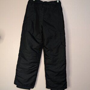 Keywords: black snow pants, youth winter pants, kids ski pants, waterproof, insulated, cargo pocket, adjustable waist, outdoor gear, cold weather, snowboarding pants, winter sports, black overalls, quilted lining, reinforced knees, youth size.