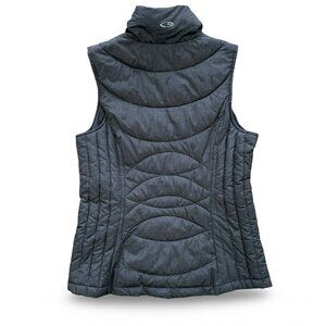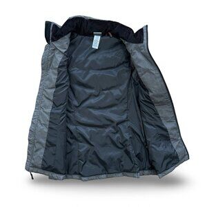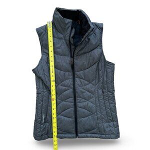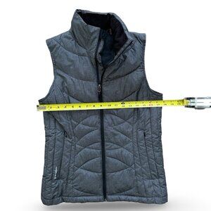 Heather grey and black women’s weather-resistant vest. Fleece lined collar and zip pockets. Please see photos for materials and measurements.
