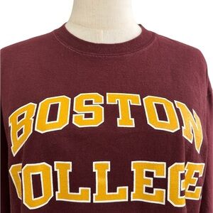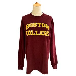 Champion Vintage Boston College Maroon Gold Long Sleeve Tee Shirt Size Large in very nice used condition. This long sleeve tee shirt is 100% cotton and has pullover styling. It is maroon with Boston College in gold letters on the front. It has a ribbed collar and cuffs on the sleeves. Measurements lying flat are approximately 20” inches underarm to underarm and from shoulder to hem approximately 27” inches.