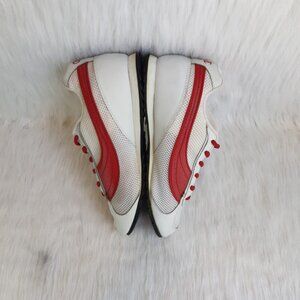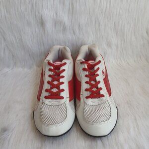 These vintage Champion sneakers are perfect for any active woman. With a white and red leather upper material, they are both stylish and breathable. The sneakers are designed for walking and running, making them a great addition to any workout routine. They are available in a UK shoe size 6, US shoe size 7.5 women's, and an EU shoe size 39.5. The Champion brand is known for its high-quality athletic wear, and these shoes are no exception. They are perfect for any woman looking for a comfortable and fashionable workout shoe.
