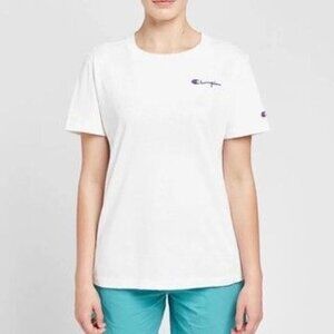 This shirt by Champion is in great condition. It is in an all-over white color. It has short sleeves and a crew neckline. It has a pullover-style opening. It is an athletic cut tee. It has an embroidered logo on the chest and sleeve. It is in unisex style with 100% cotton material.