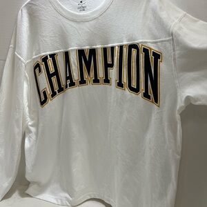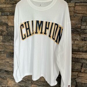 White long sleeve shirt with bold Champion logo. Comfortable and stylish.