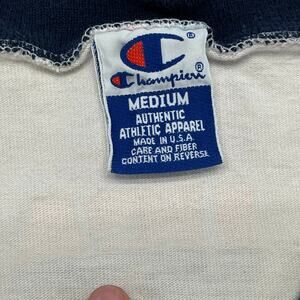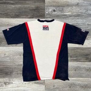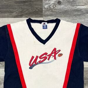 Champion White Navy Mens M Official Outfitter 1996 USA Basketball Team T-Shirt v neck short-sleeve colorblock navy white and red colorway knit pure cotton made in USA