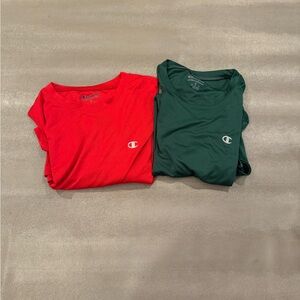 Classic white tee featuring repeated Champion logo. Comfortable short sleeves. Crew neck design.