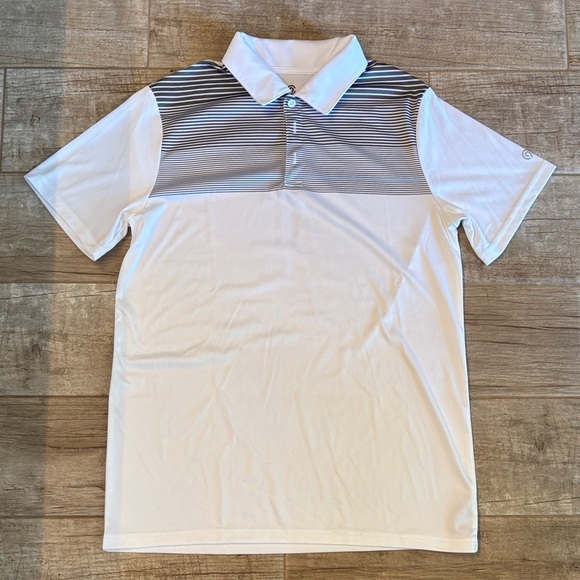 Item: Stylish Champion polo with white and gray stripes. Comfortable and versatile for any occasion.