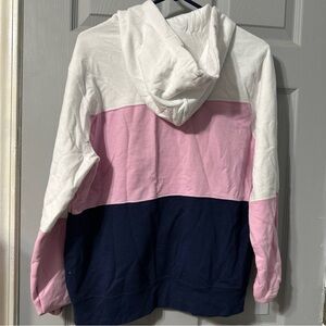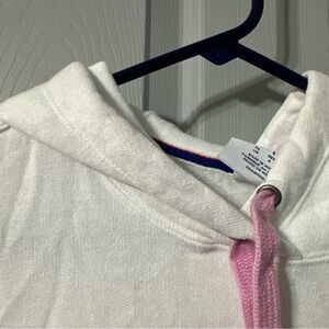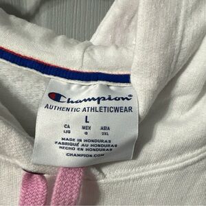 Stylish Champion hoodie with pink drawstrings. Features iconic logo. Perfect for casual wear.