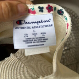 Floral letters Champion Womens Beige French Terry Logo Crew Neck Long Sleeve Sweater Size large