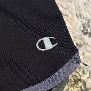 Sleek black shorts with gray trim. Ideal for exercise and leisure. Champion logo on the side. Super comfortable with an extra thick waist band for a little bit of tummy control. In excellent condition. Coming from a pet free and smoke-free home.