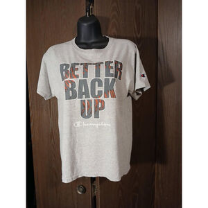 Heather gray Champion short-sleeve tee featuring the bold “BETTER BACK UP” front graphic with orange and black detailing. Classic crewneck style with soft fabric and the Champion “C” logo patch on the sleeve. Tag size L (women’s).