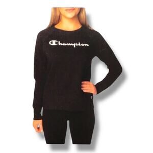 The Champion Women's Long Sleeve Crewneck Sweatshirt in size XXL boasts a casual logo, perfect for an active athleisure lifestyle. Designed in black with performance fleece, it combines cotton and polyester for comfort and durability.