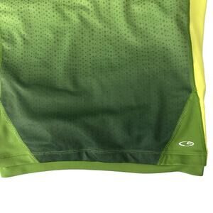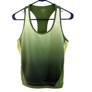 Stay supported and stylish with this Champion women’s workout tank top in size Medium. Designed with a built-in shelf bra and racerback cut for ultimate comfort and performance, it’s made from a stretchy, breathable polyester/spandex blend. The fitted silhouette flatters your shape while staying secure during movement. Features a convenient back pocket—perfect for keys, coins, or your iPod on the go. The sporty green design with lime green and white trim adds a bold pop of energy to your activewear lineup.