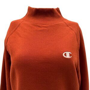 Tags: Champion sweatshirt, women's pullover, mock neck sweater, rust sweatshirt, Champion XS, casual sweatshirt, cotton blend sweater, long sleeve pullover, relaxed fit top, athletic wear, soft women's top, Champion logo shirt, ribbed cuffs sweatshirt