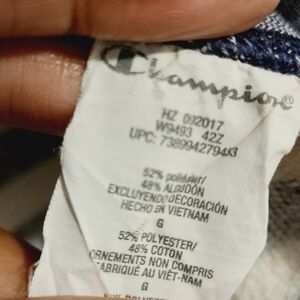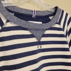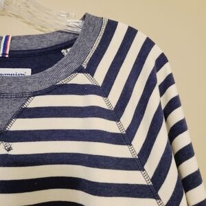 Perfect slouchy sweatshirt for daily errands. Women's striped navy and off-white raglan crewneck sweatshirt by Champion, size large. Machine washable; cotton and polyester blend. Excellent pre-owned condition; no flaws.