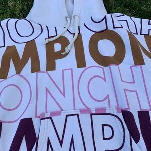 Great pre-owned condition Champion Big Block Text Hooded Sweatshirt in Chalk & mixes color print. Drawstring hood. Reverse weave. Ready to wear.