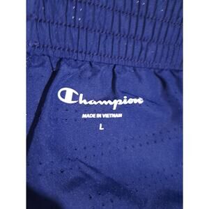 The Champion Women's Running Shorts in size L are designed for athletic performance, featuring a solid navy blue color with a mesh fabric for breathability. The drawstring closure and elastic waist ensure a comfortable fit for activities such as gym training and running. Made of polyester material, these machine washable shorts are perfect for the summer and spring seasons, making them ideal for active women looking for quality activewear in a sporty style.