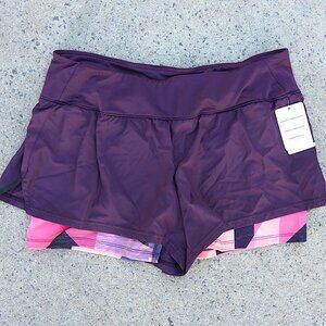 Color: The outer short is a Deep Purple/Plum/Maroon. The inner compression short features a bold pink, black, and purple geometric/plaid print.