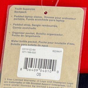 Top two-way zipper closure. Roomy main compartment with organizer panel, padded internal laptop sleeve, adjustable padded shoulder straps. Front storage pocket with organizers, exterior side water bottle sleeve. Embroidered Champion at the side and large embroidered “C” logo at the front. Approximate measurements: 11 1/2" (L) x 18" (H) x 6" (W)