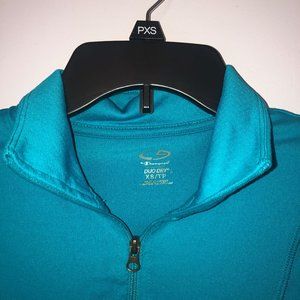 Full zip-up running jacket in a bright teal color. Made with DuoDry fabric and has two zip-up pockets. Comfortable for working out or relaxing in!
