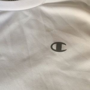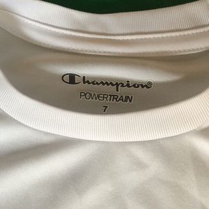 Cute size 7 champion powertrain boys white sweat repellent T-shirt. Shirt has two small round yellow stains near the Champion logo and a slight imperfection at the bottom of the front center. With both imperfections are visible in the pictures. Thus, the reduced price for a labeled boys top. 😄.