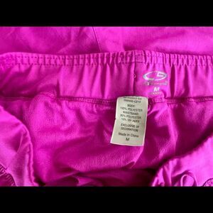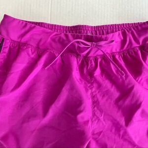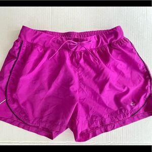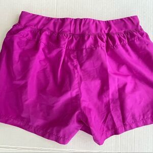 Champion pink running style shorts with attached inside panty, size S. Elastic waistband with drawstring tie. 100% polyester . Approximate measurements are waist flat 14”, length from waist approximately 12”
