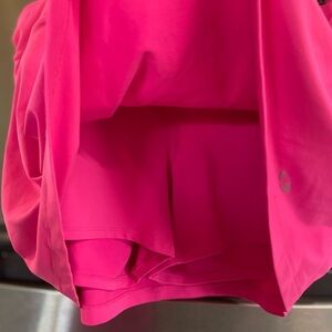 Hot pink Spork short skirt combo key pocket inside little snagged tear area on the front just on the outer edge still has the shorts underneath to cover, logo on the left hem area waistband women’s size extra large
