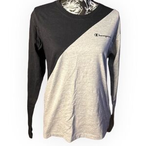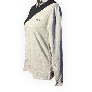 champion sweatshirt, color block hoodie, grey and black pullover, sporty casual sweatshirt, trendy hoodie, champion logo wear, everyday athletic wear, comfy streetwear, oversized sweatshirt, gym hoodie