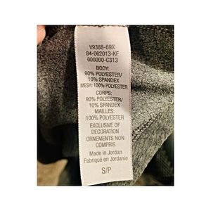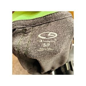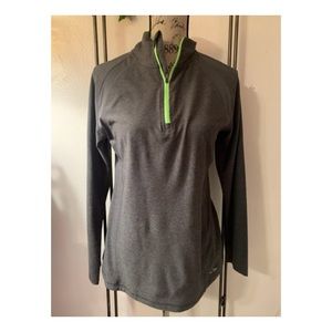 Excellent pre-loved 1/4 zip pullover, size small. Has cute small ruffle on the back. Material is polyester and spandex. No flaws, color is gray and lime green.