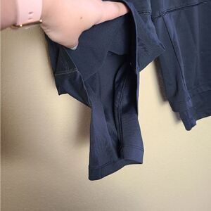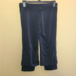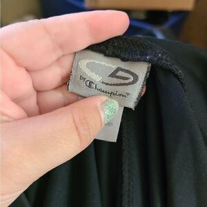 This is a pair of black athletic pants by champion. They have compression likings underneath.