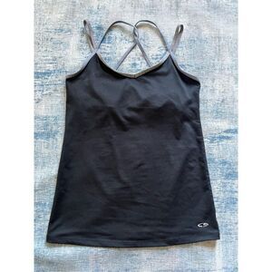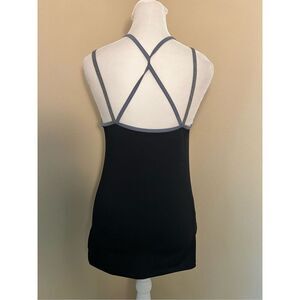 Black athletic tank top with heathered gray and slate blue accents and straps. Built in shelf bra with strappy back design. I'm so sad this doesn't fit me!