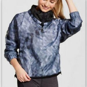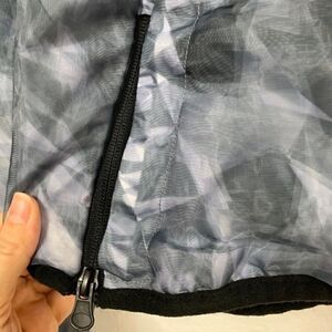 Holographic look with printed geometric sheer layer over printed solid layer. Side zip vents. Funnel neck with zipper. Velcro kangaroo pocket. Polyester. Pre-owned, in great condition. Measurements laying flat are: Chest: 19” Front Length: 20”