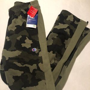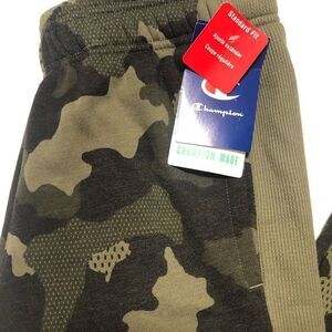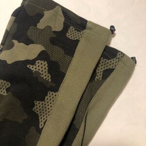This is new with tags. The color is green camo. The fabric is 57 % cotton, 43 % polyester. Fleece lined. The inner drawstring waist is 30 inches, stretches to about 40 inches. The length from top to bottom is 41 inches. The cord adjust leg opening is 14 inches measured around.