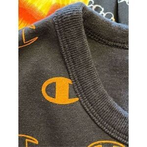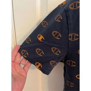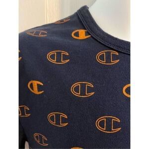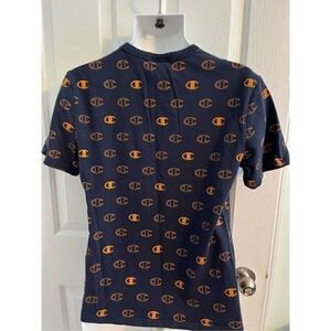 Champion Navy Blue Short Sleeve T-shirt with orange all over logo. Size Small