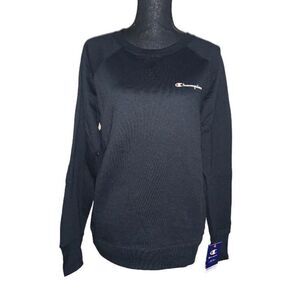 Black Powerblend classic sweatshirt. Crewneck. Long sleeve with ribbed knit cuff. Logo script on left chest. C patch on left wrist. V-notch detail at neckline. Reduced pilling. Reduced shrinkage. 60% polyester/40% cotton. Size: large. NWT.