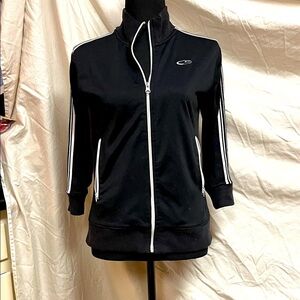 Stylish black track jacket featuring white stripes and a zip-up front. Perfect for casual wear.