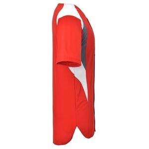 The Bull Pen Jersey is constructed of 100% polyester knit fabric that is mid-weight and abrasion resistant. The 2-color contrasting side and shoulder insert are made of 100% polyester pin-dot fabric. Features include set in sleeves with double needle hem. There is a 6-button front spaced for lettering. The bottom of the shirt is curved with a serged edge.
