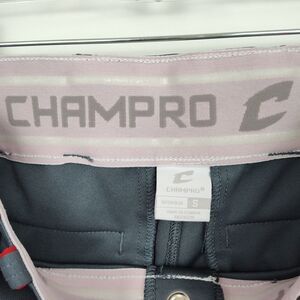 The product is a pair of Champro women's softball pants in size small, designed in a dark gray color with red accents. These pants are specifically tailored for female athletes playing softball, offering a comfortable fit and stylish design. With the trusted Champro brand name, these pants are sure to provide durability and functionality for players during games and practices.