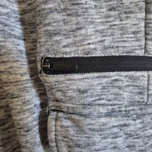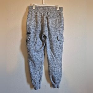 Comfortable gray sweatpants. Features black drawstring and pocket accents. Ideal for casual wear.