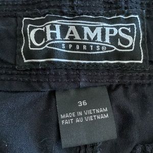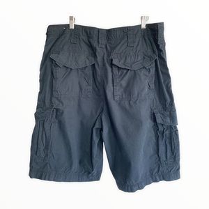 These sturdy black shorts have button waist & zip up fly. 2 front slide in pockets. 2 cargo front pockets with snap flap closure. 2 back snap flap pockets.