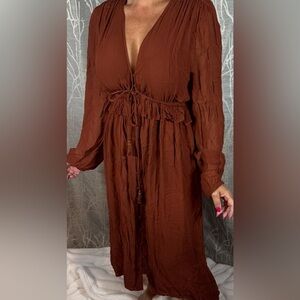This Chan Luu bohemian-style maxi dress blends effortless elegance with a relaxed silhouette, perfect for both daytime and evening wear. Crafted in a rich earthy brown tone, it features a deep V-neckline, smocked waist detail, and a tie-front closure for a flattering fit. Long sleeves with gathered cuffs add a touch of romantic charm, while the lightweight crinkled fabric enhances its breezy, flowy drape. Note: AI model cover photo images are for style reference only. Please review subsequent garment photos for true color, fabric texture, and condition.