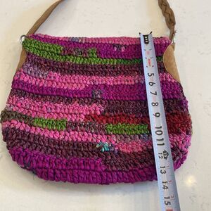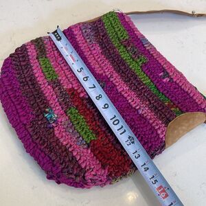 This vibrant handcrafted shoulder bag features a stunning mix of pink, green, and brown hues. Perfect for adding a pop of color to any outfit.