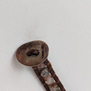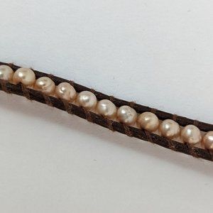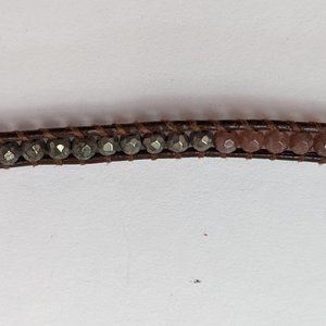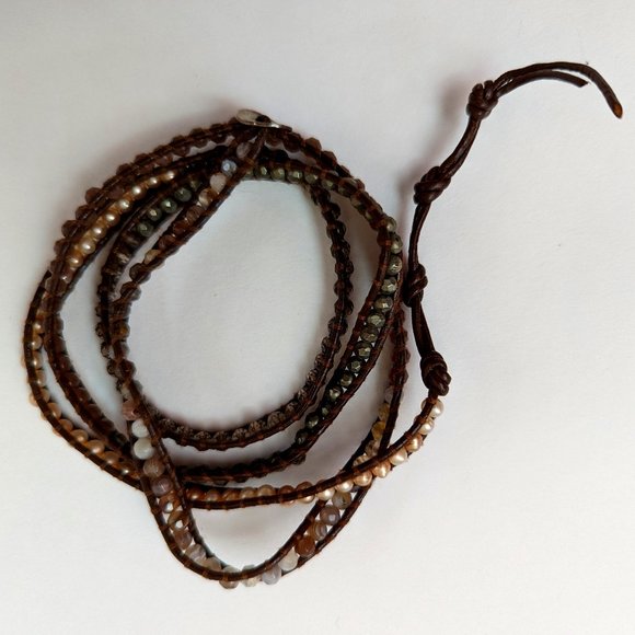 Mix of pearl, quartz, and gunmetal stones with brown leather. Wraps 5x around wrist, silver closure with multiple size adjustment.
