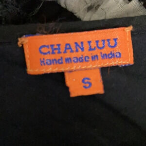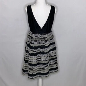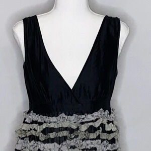 Chan Luu Raw Edge Ruffle Striped Baby Doll Dress in a size small. Good pre-owned condition. There is a spot right above the zipper that looks like it was sewn up on the seam. All of the ruffle stripes are fabric and raw edges. Deep v neckline and even deeper v in the back. Side hidden zipper closure. Semi sheer, blacks and grays, silk and cotton blend. Approximate measurements: 16 1/2" bust, 35" length.