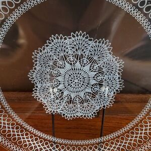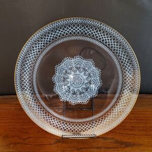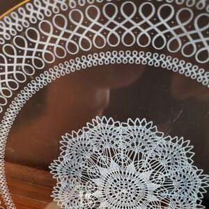 Clear glass with lace perimeter and doily centerpiece and has gold trim. Can be used to serve pastries, cakes, breads, etc.